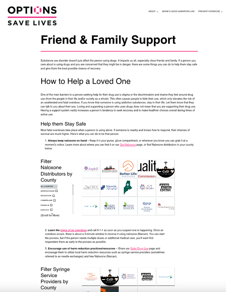 Contact your local OPTIONS liaison for guidance on naloxone, Maine's Good Samaritan Law, or suitable substance use disorder (SUD) services for yourself or a loved one.